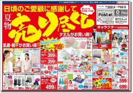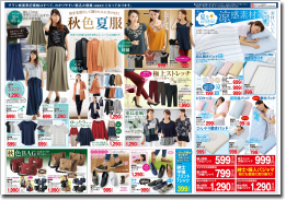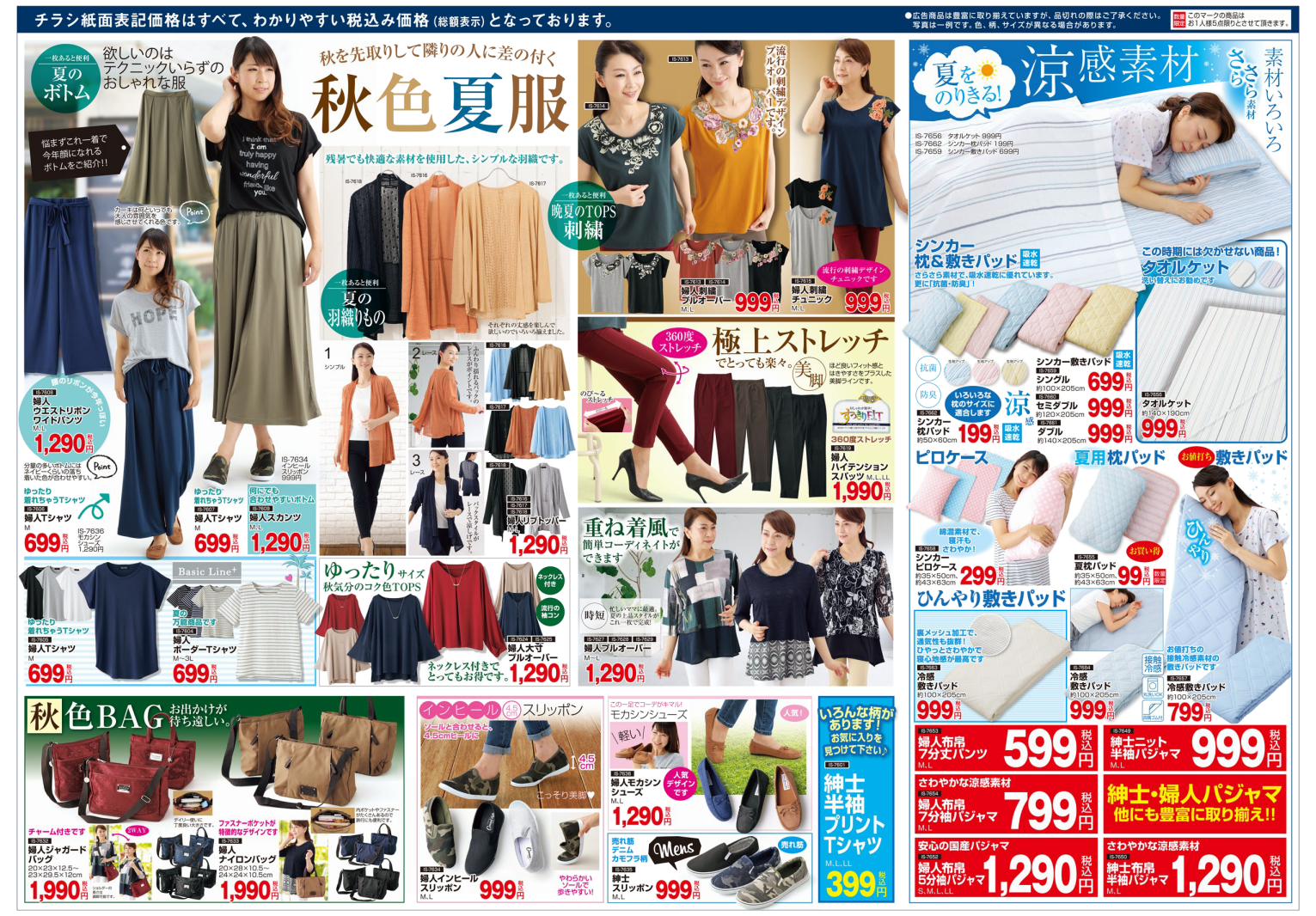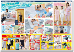 今回のテーマは、「夏物アウターバーゲン」「夏キャラ特集」「タオル祭」「こまったを快適に変える」「快適生活応援、涼感ホームファッション」などに加え、「いい値! 満足!お買得!!」と題しまして、サンダル、ソックスから肌着まで、驚きの激安特価のオンパレードでございます。