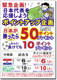 まずは、12月5日(月)の24時、つまり6日の0時キックオフのクロアチア戦で勝てば、6日(火)に、タイヘイコジカカードをご提示の上で、1回あたり税込1,000円以上お買上げのお客様全員に50ポイントを進呈します。負けても10ポイント進呈いたします。