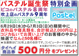 パステル誕生祭特別企画といたしまして、6月29日 水曜日から7月3日、日曜日までの期間中に、衣料品や寝具類を、合計税込2,000円以上コジカ払いでお買い上げのお客様の中から、コンピューターによる抽選でなんと50名様に、タイヘイ商品券500円分をプレゼントいたします。