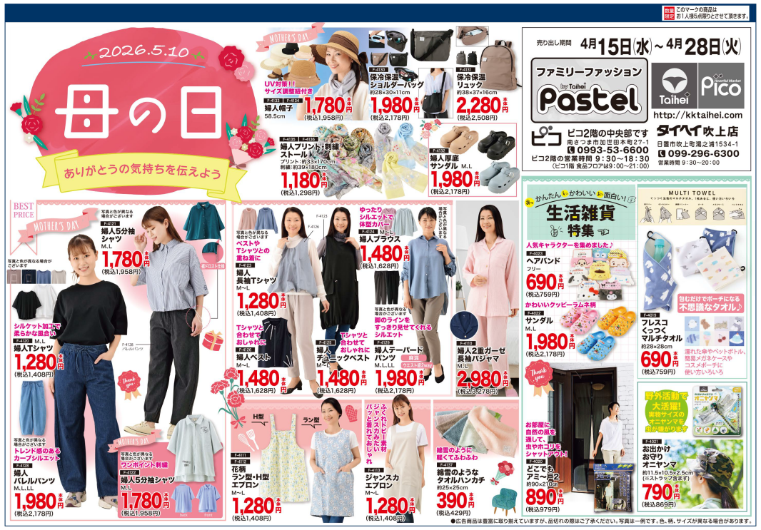 4月15日(水)の南薩地区(一部を除きます)の新聞には、パステルのチラシを折り込みます。